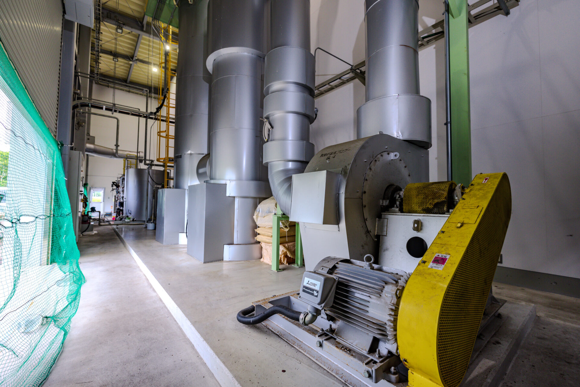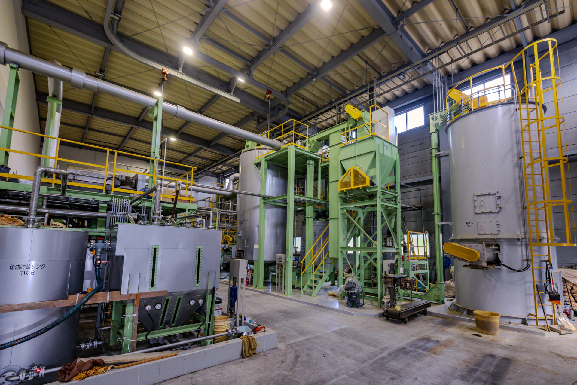 ミール工場では、魚粉を取り除いたあとの魚脂から水分を除去し、自社工場のボイラー燃料として活用。