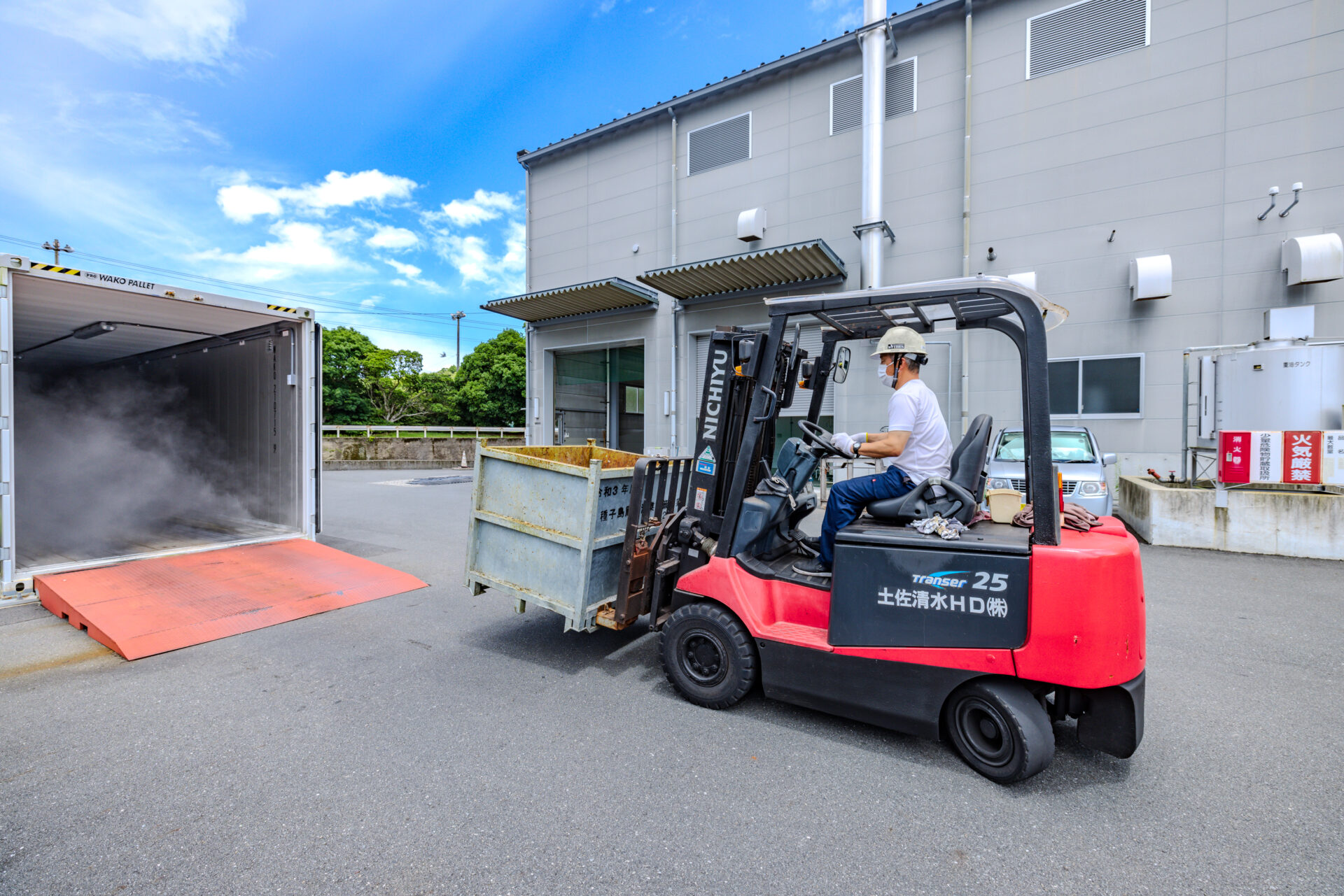 土佐清水食品のミール事業部では、毎日12:00になると、宗田がつおの下処理を行う煮熟工場から骨や皮などの「アラ」を取りに行き、破砕や水分と油分の分離などを行い、それぞれ有用な商品として生まれ変わらせています。