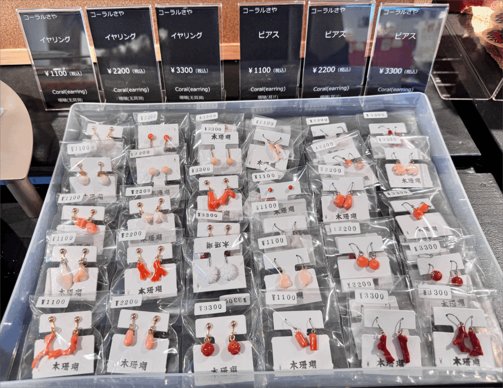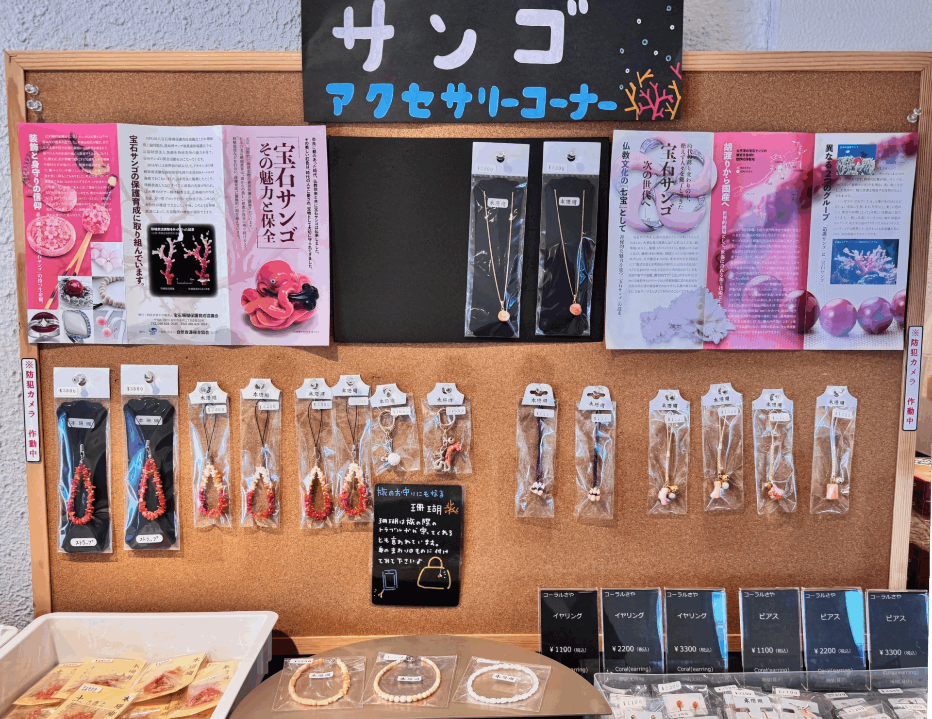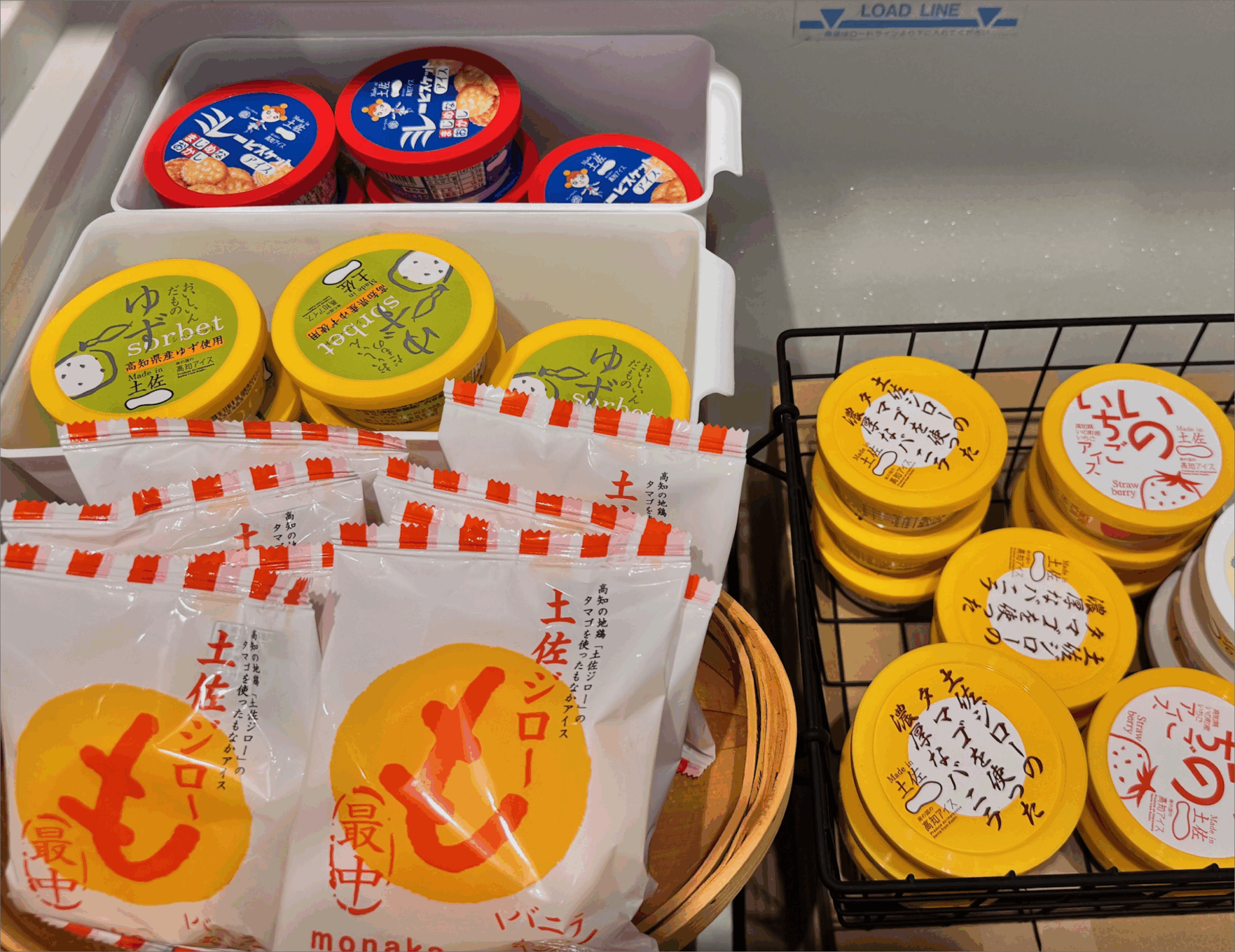 日本酒と酒の肴、作家性の強い珊瑚のアクセサリー、高知県産の果物をふんだんに使用したご当地アイスやゼリーなどを扱っています。