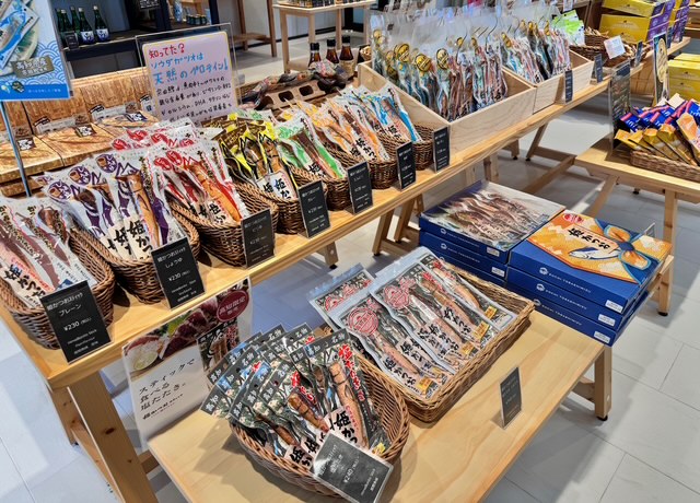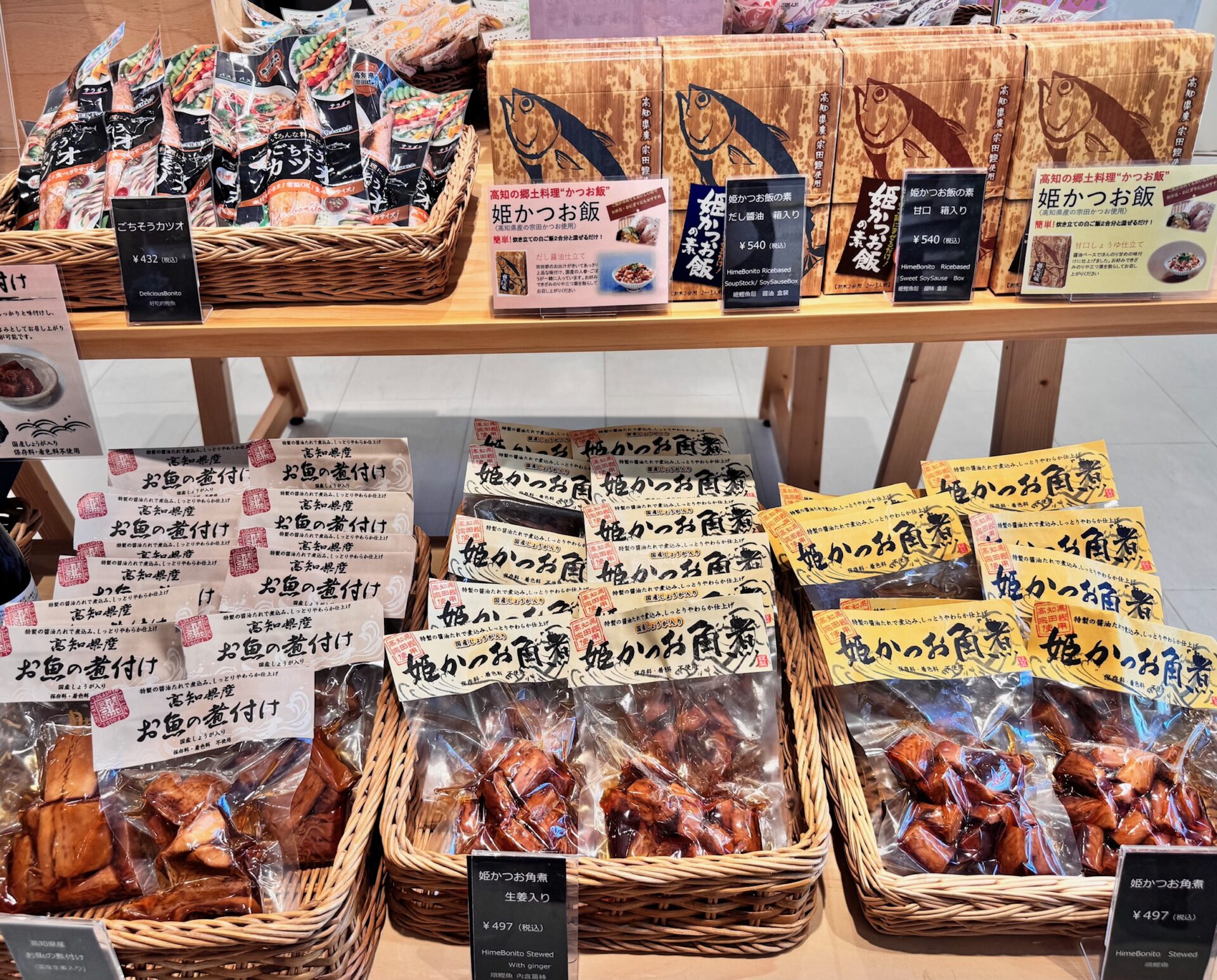 ザマナマーケット店内には、土佐清水市の特産品である宗田がつおを使った商品や、高知県内の厳選された食品やお土産物が並びます。
